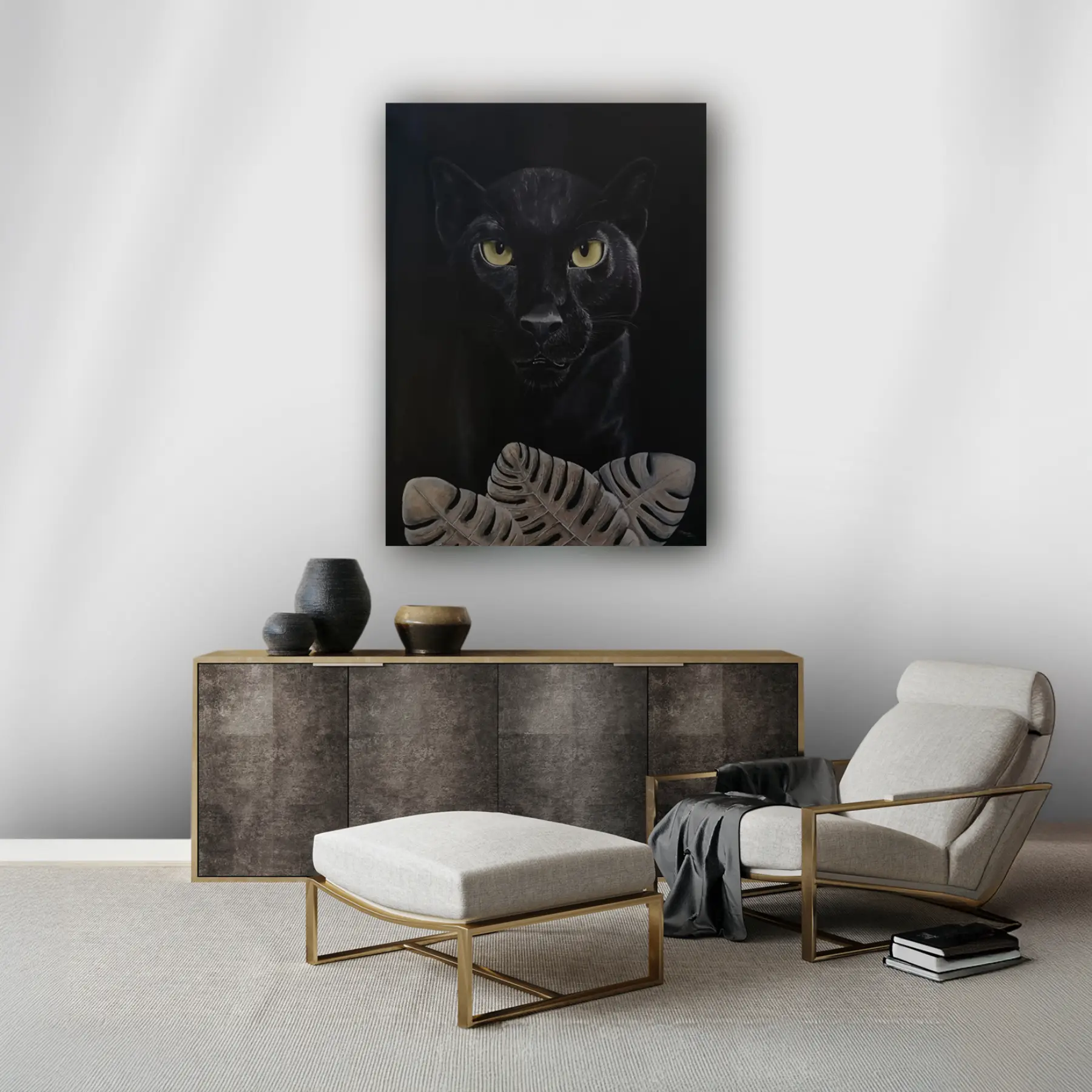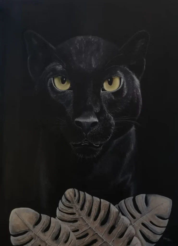 Mirada Salvaje I” es una obra original de Mónica Torres, realizada en óleo sobre lienzo, que nos enfrenta al magnetismo de una pantera negra, símbolo de misterio, elegancia y poder. El contraste entre el pelaje oscuro, apenas iluminado por delicadas pinceladas de luz, y los penetrantes ojos ámbar crea una atmósfera intensa y envolvente.