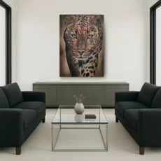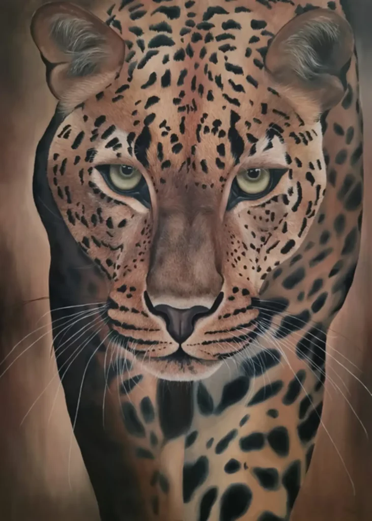 Cada detalle del pelaje, la precisión de las manchas y la fuerza de los ojos están tratados con una minuciosidad excepcional, logrando que la figura trascienda el lienzo y parezca cobrar vida. Más allá de lo visual, la obra transmite un mensaje profundo: la belleza indómita de la naturaleza, el equilibrio entre poder y sutileza, y el respeto por lo salvaje. “Mirada Salvaje III” es una pieza que llena cualquier espacio de carácter, energía y sofisticación.