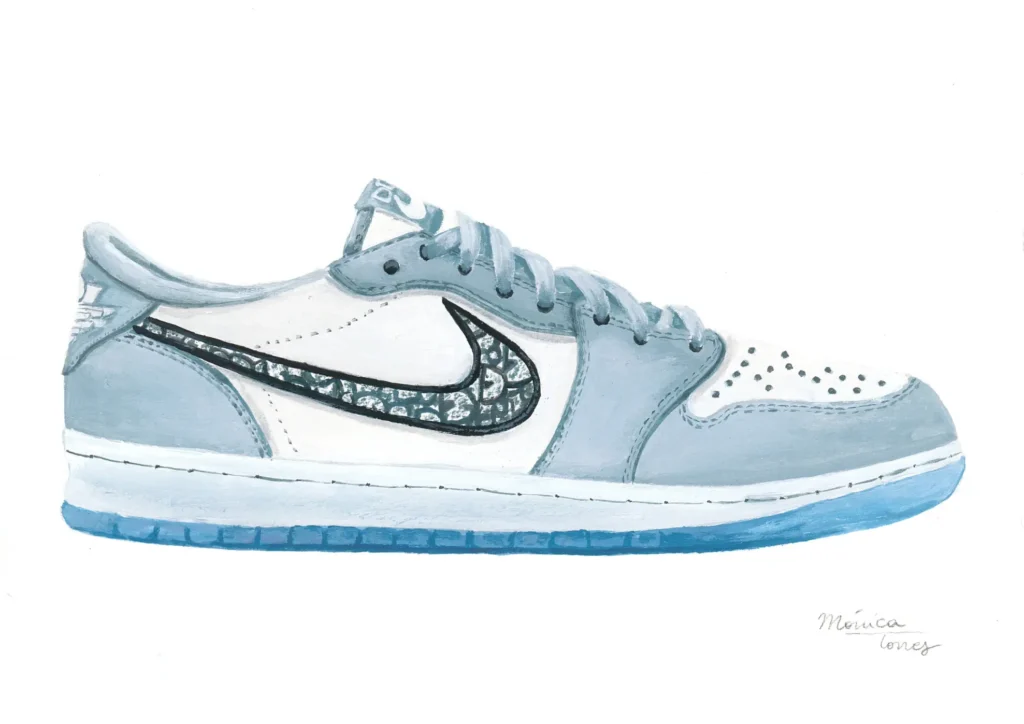Esta acuarela representa la exquisita Air Jordan 1 Low OG Dior, una de las colaboraciones más codiciadas en la historia del streetwear de lujo.