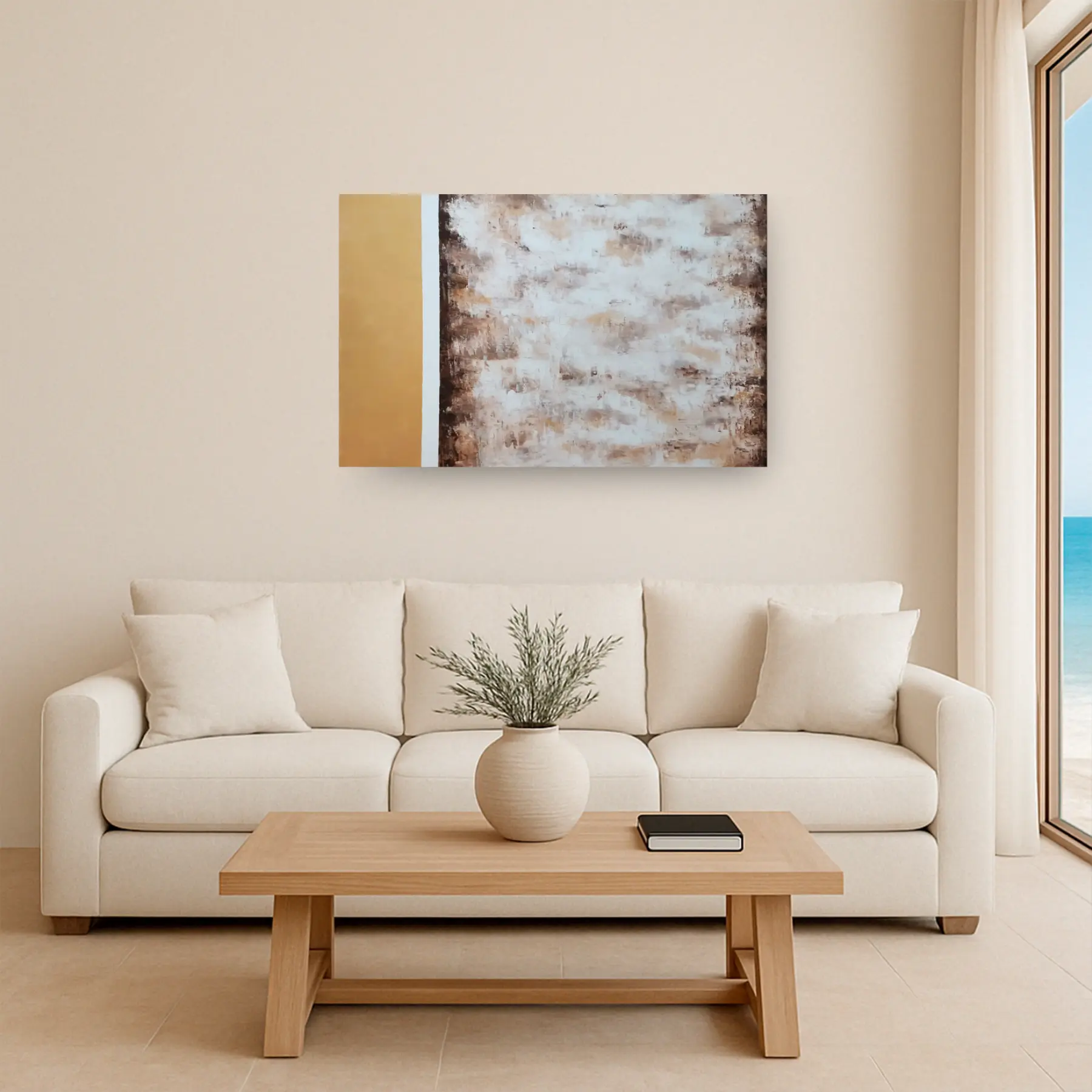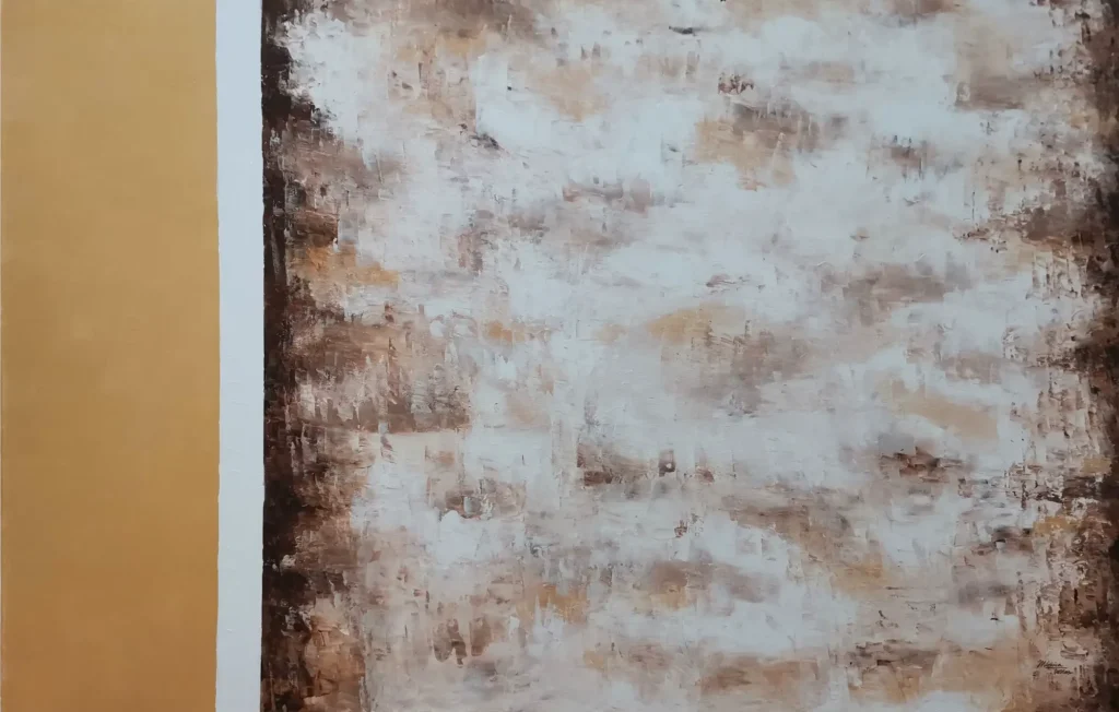 “Arena y Tiempo II” es una obra original de Mónica Torres, realizada en técnica mixta sobre lienzo, que continúa la reflexión sobre el paso del tiempo y la huella de la naturaleza. La composición se articula a partir de una franja vertical de color arena que contrasta con un campo texturizado de tonos ocres, blancos y marrones, evocando la erosión, la tierra y el desgaste suave de los elementos.