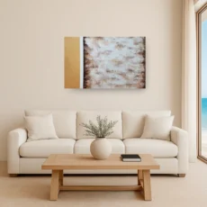 La división limpia entre las áreas cromáticas crea un delicado equilibrio entre lo ordenado y lo orgánico, lo racional y lo espontáneo. “Arena y Tiempo II” invita al espectador a detenerse y contemplar, a dejarse envolver por la calma que transmiten sus tonos cálidos y su lenguaje minimalista, mientras sugiere el diálogo eterno entre tierra y tiempo.