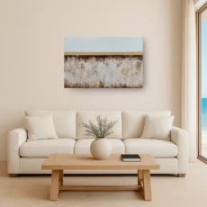 La línea horizontal que separa ambos planos actúa como un límite simbólico entre cielo y tierra, entre lo efímero y lo eterno, invitando al espectador a detenerse y contemplar. “Arena y Tiempo” es una obra que transmite calma, profundidad y contemplación, perfecta para quienes buscan en el arte una conexión serena con los elementos esenciales de la naturaleza.