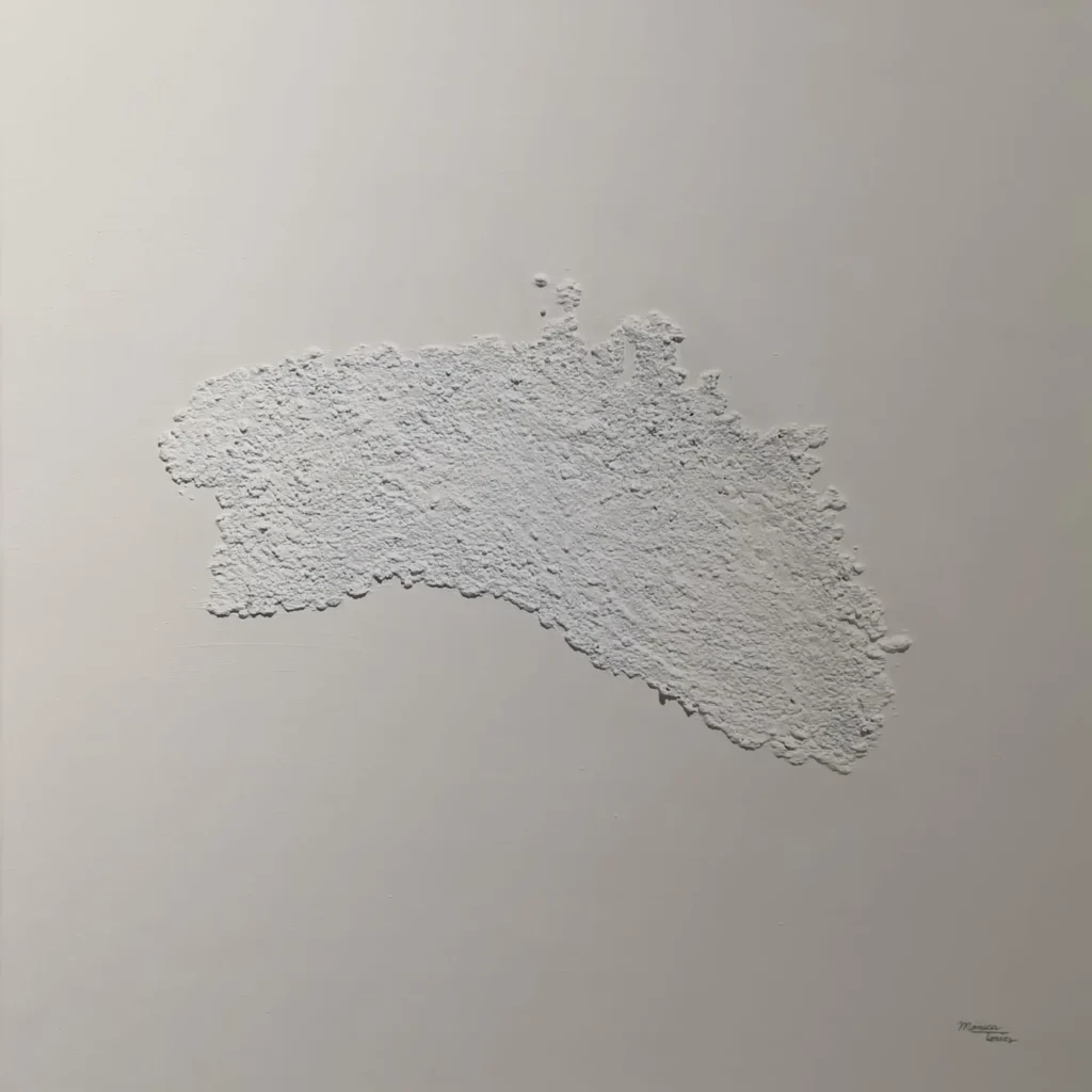 “Cal-a D’Or” es una obra original de Mónica Torres, realizada en técnica mixta sobre lienzo. La pieza presenta la silueta en relieve de Menorca, vista desde el aire, destacando sobre un fondo limpio y luminoso que acentúa su forma orgánica.
