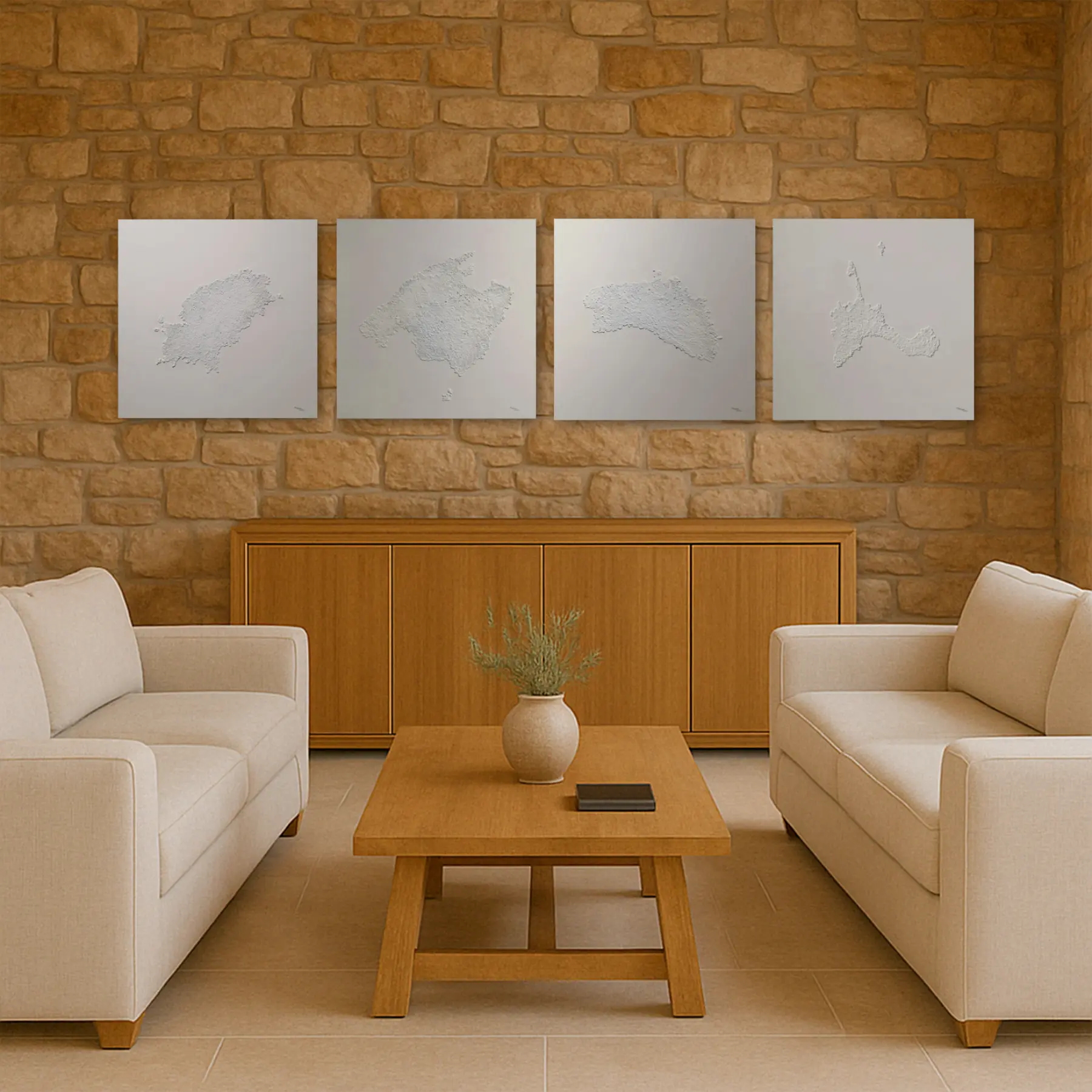 El trabajo de textura cuidadosamente aplicado genera un juego sutil de luz y sombras, invitando a descubrir cada detalle del contorno y evocando la belleza natural de la isla. Con una estética minimalista y elegante, “Cal-a D’Or” aporta calma, sofisticación y un guiño geográfico único a cualquier espacio.