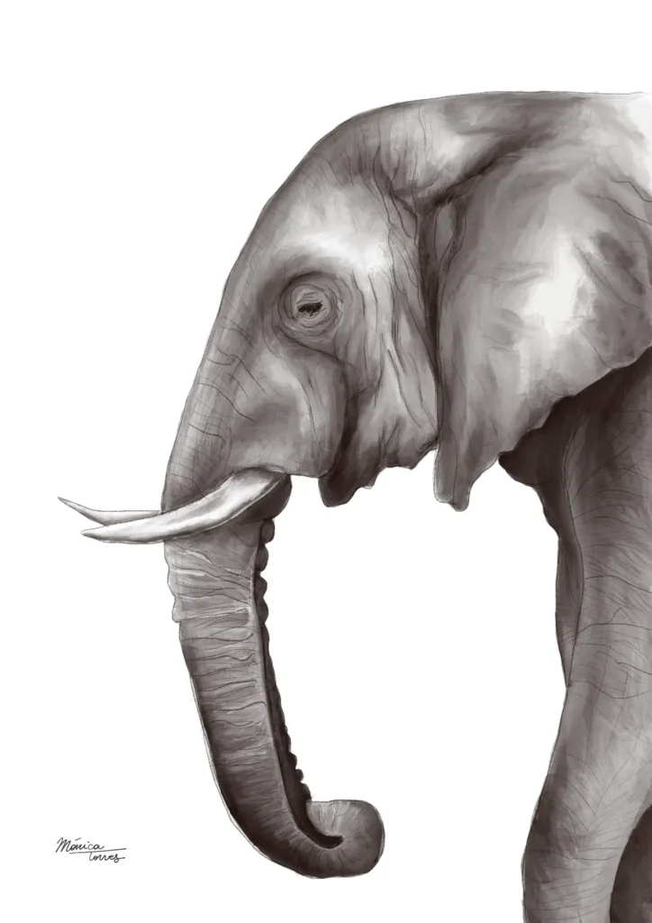 Esta ilustración digital a color del elefante resalta por su elegante sencillez y precisión. El artista ha trabajado con tonos monocromáticos que permiten percibir cada pliegue, arruga y textura de la piel del elefante, logrando transmitir su sabiduría ancestral y su imponente presencia.