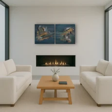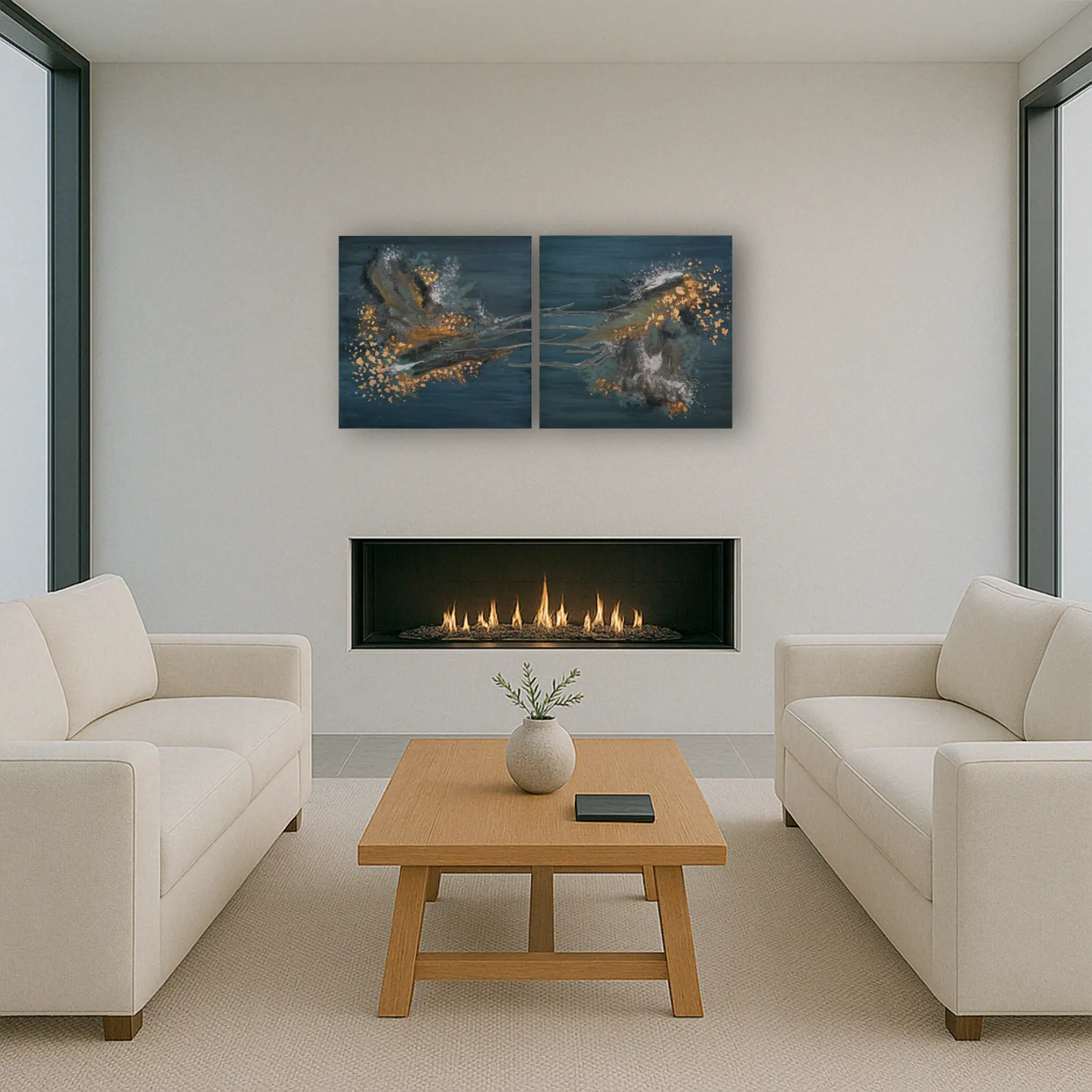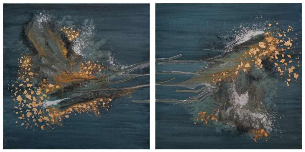 “Espejismo” es un díptico original de Mónica Torres, realizado en técnica mixta sobre lienzo, que nos invita a sumergirnos en un universo donde lo real y lo ilusorio se entrelazan. Sobre un fondo profundo en tonos verde-azulados, surgen explosiones de dorado, blanco y negro que evocan fragmentos de luz, espuma y materia en movimiento.