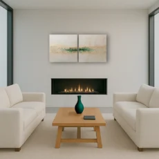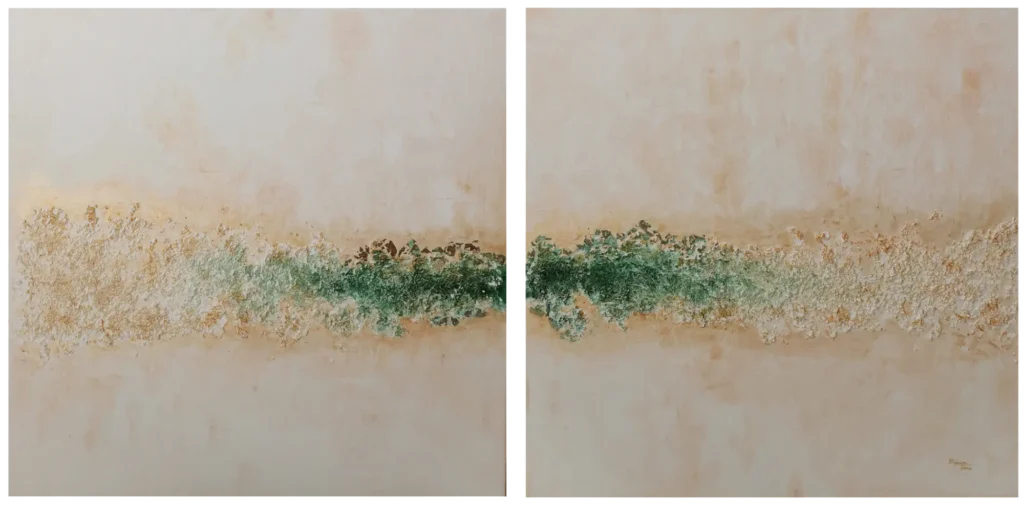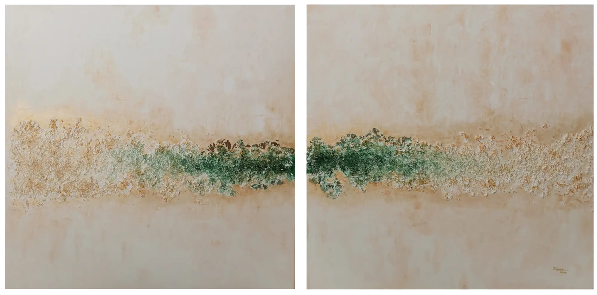 Sobre un fondo claro y sereno, una franja texturizada en verdes, ocres y tonos tierra atraviesa los dos lienzos, evocando una cicatriz que recorre la superficie. La transición de lo denso a lo desvanecido sugiere un proceso de desaparición, recordando al espectador la vulnerabilidad de los ecosistemas frente a la acción humana.