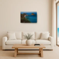 El detalle minucioso en las formas de la costa, las pequeñas construcciones y las islas que emergen en el horizonte transporta al espectador directamente a este lugar, transmitiendo la serenidad, la luz y la energía del entorno. “La Falzia” es una pieza que invita a la contemplación y al recuerdo, perfecta para quienes buscan llevar a su espacio un pedazo del Mediterráneo, lleno de vida y autenticidad.
