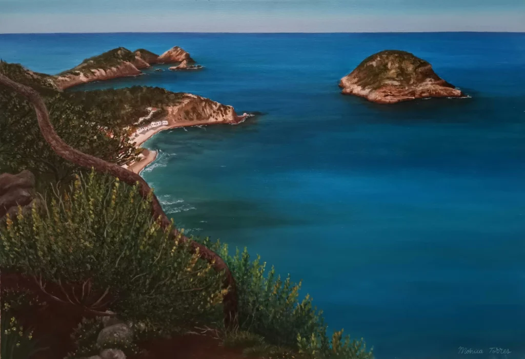 “La Falzia” es una obra original de Mónica Torres, realizada en óleo sobre lienzo, que captura con maestría el paisaje costero de Jávea desde un ángulo privilegiado. La artista plasma la belleza natural de este rincón mediterráneo, mostrando el contraste entre el intenso azul del mar y la vegetación que enmarca la escena en primer plano.