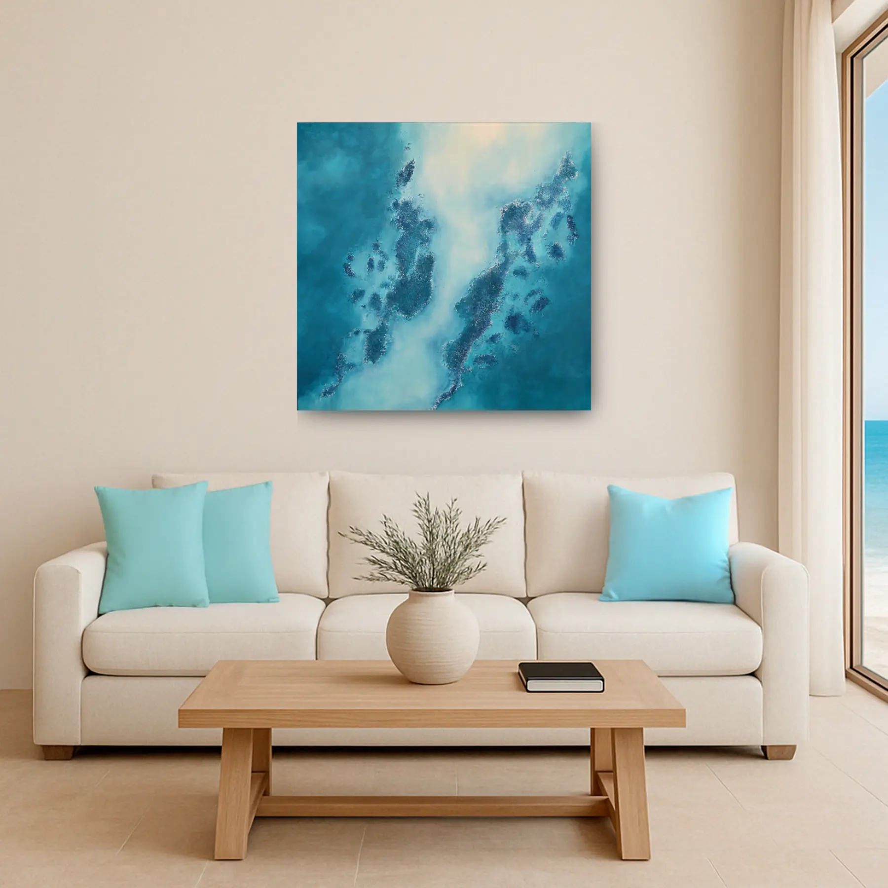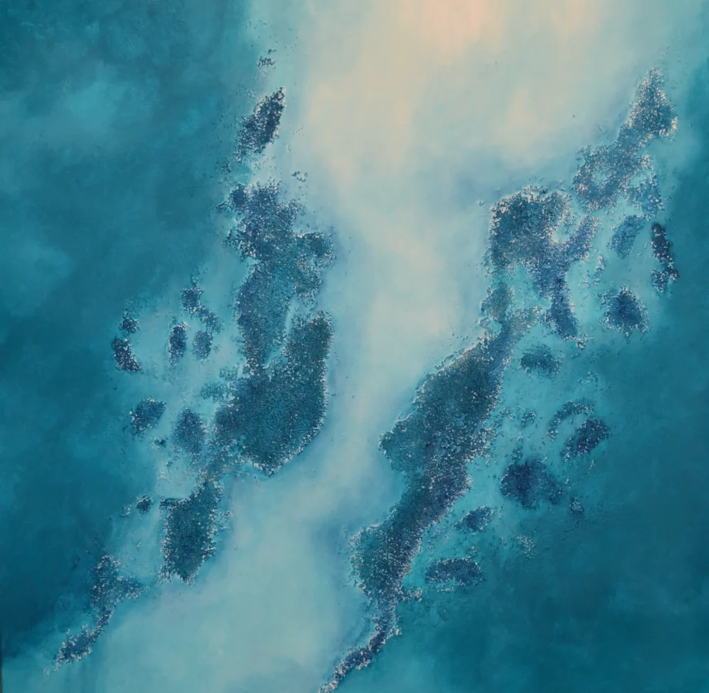 “Mediterranean III” es una obra original de Mónica Torres, realizada en técnica mixta sobre lienzo. La pieza evoca una costa o archipiélago visto desde el aire, con texturas que recuerdan islas, arrecifes y orillas delineadas por el contraste entre azules intensos, turquesas y suaves destellos dorados.