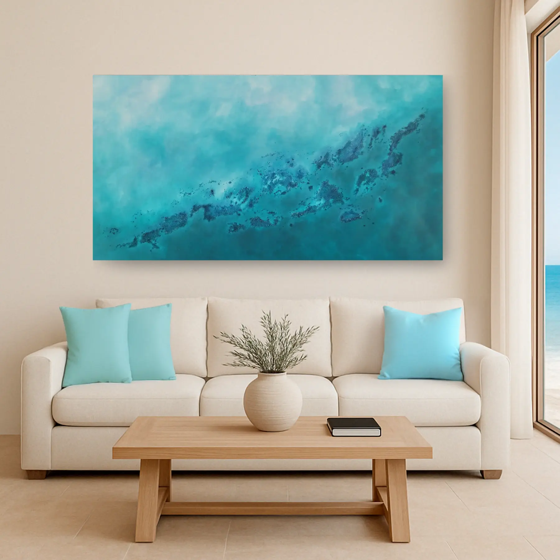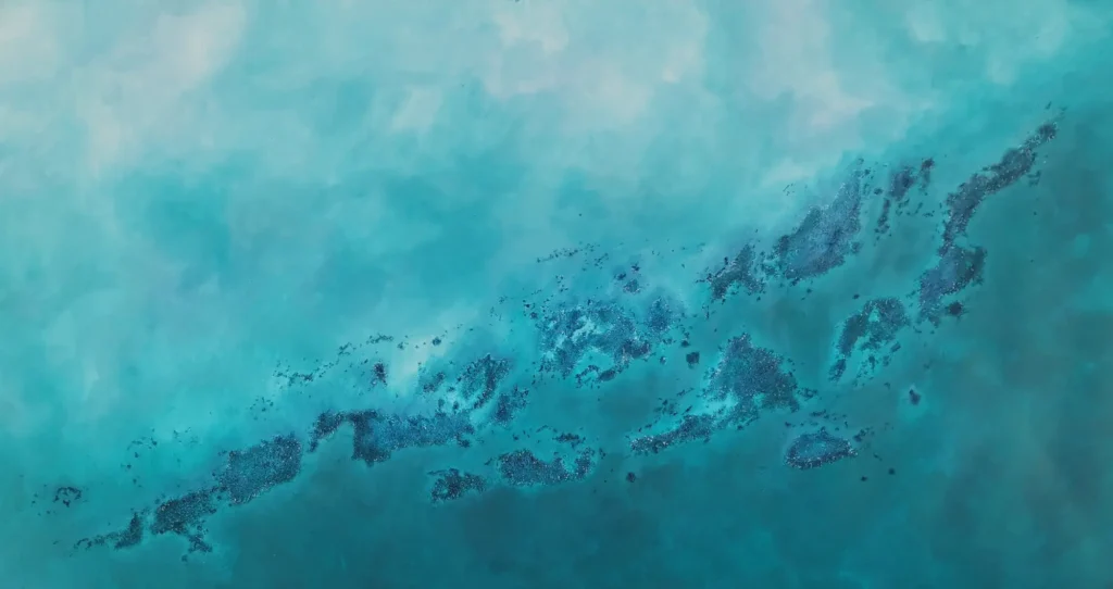 “Mediterranean V” es una obra original de Mónica Torres, realizada en técnica mixta sobre lienzo. La pieza evoca una costa o archipiélago visto desde el aire, con texturas que recuerdan islas, arrecifes y orillas delineadas por el contraste entre azules intensos, turquesas y suaves destellos dorados.