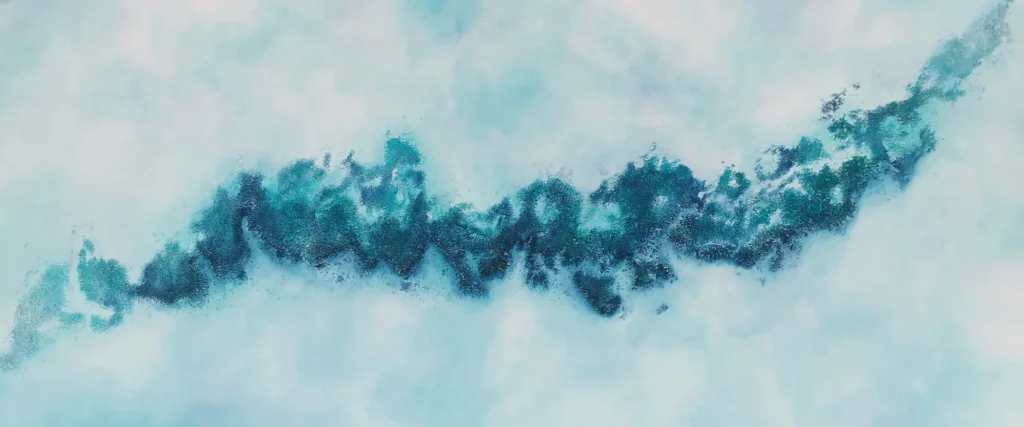 “Mediterranean VI” es una obra original de Mónica Torres, realizada en técnica mixta sobre lienzo. La pieza presenta una serie de formas orgánicas que evocan un archipiélago visto desde el cielo, flotando sobre aguas turquesas y azuladas. Las texturas, cuidadosamente trabajadas, sugieren costas irregulares y arrecifes que emergen entre brumas de luz y color.